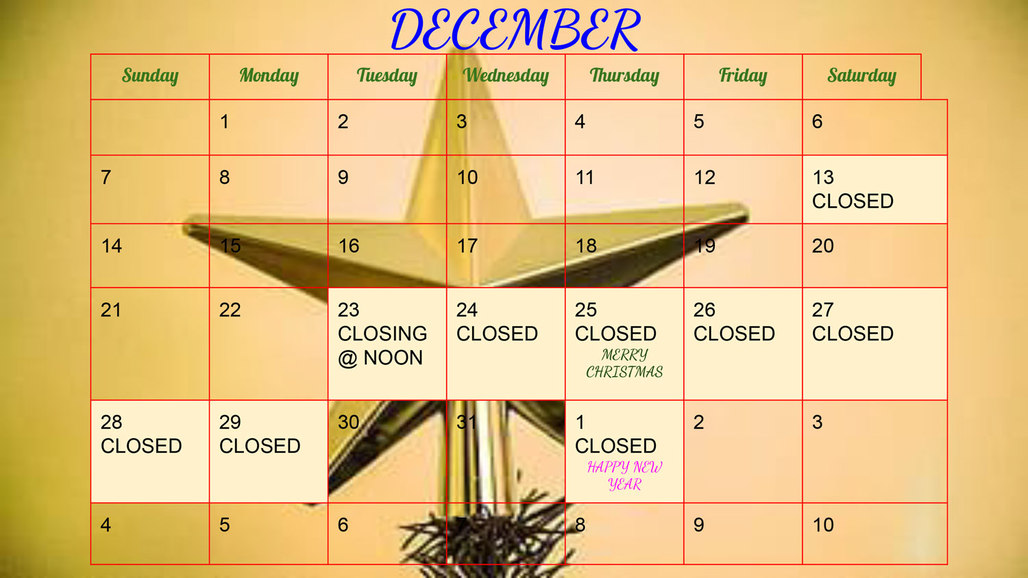 Please See the Following Calendar for Our Holiday Hours